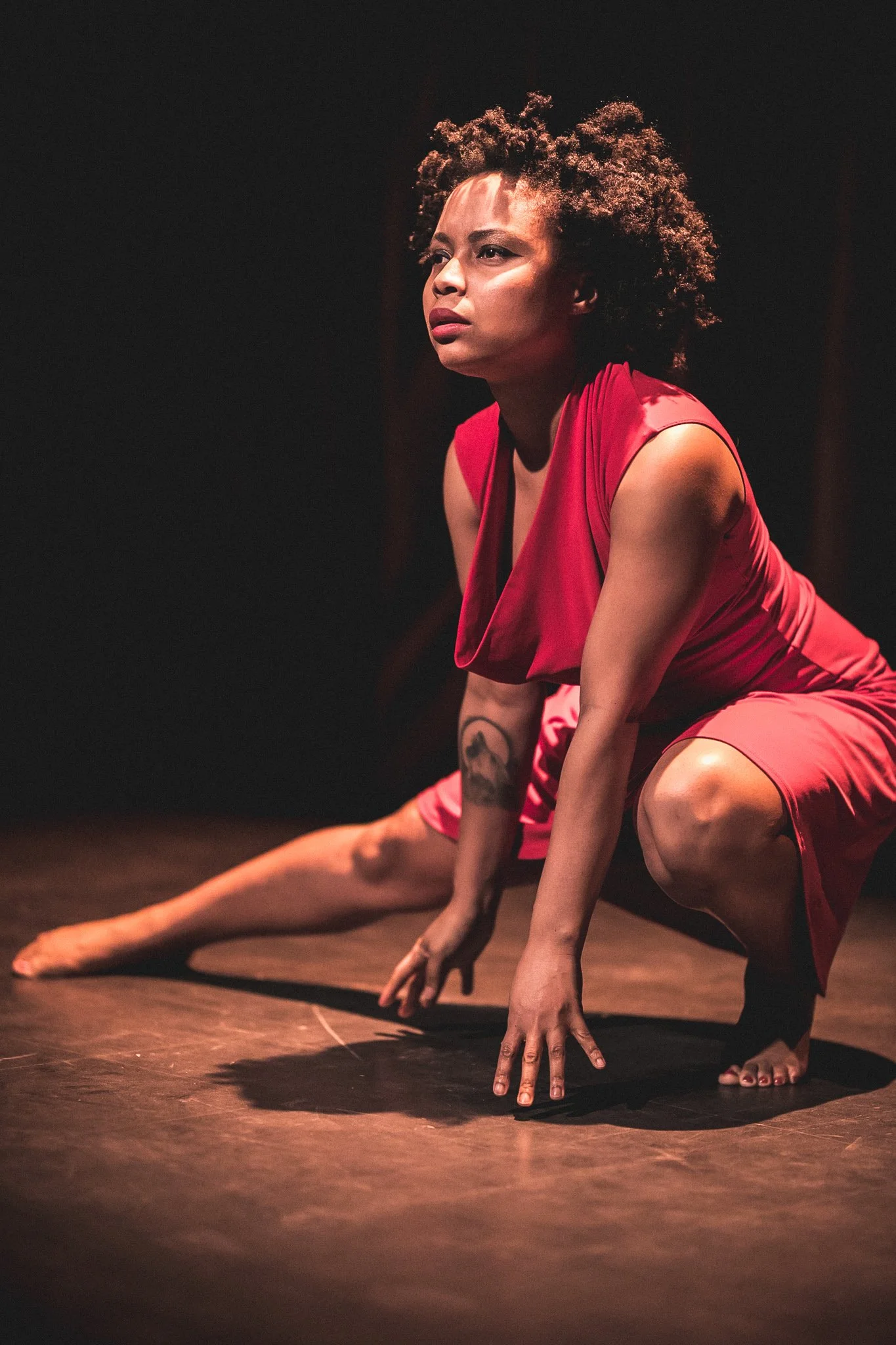 Dressed in an ankle length, bright red robe, Dainty began her first piece, a burlesque number, in which she confidently and playfully removed and threw the robe to the floor to reveal a black and red burlesque costume. From her posture to her gaze, she radiated confidence and class. Dainty spoke to Neena about the form of Burlesque, and that it is really about finding your inner confidence and how to hold space. The dance form was a way to self-discovery for Dainty. She also spoke about the power of red lipstick; how it can empower one to feel seen and “show up”, as the colour red is striking and often draws attention. I really enjoyed when she spoke about learning burlesque and that the dance is more about learning about yourself, finding your own self-worth than it is about trying to impress or perform for somebody else. There was something that I found relatable as I heard Dainty’s story as an artist, especially when she described how she often went to the library and looked up books to find someone who looked like her that was doing what she loved. I relate to the sentiment of finding representation; to feel less alone and perhaps feel like you belong somewhere. Some words that came to mind, as I watched Dainty perform were ‘sensual’, ‘confident’, ‘knowing oneself’, ‘holding space’, ‘playing’, ‘fun’.